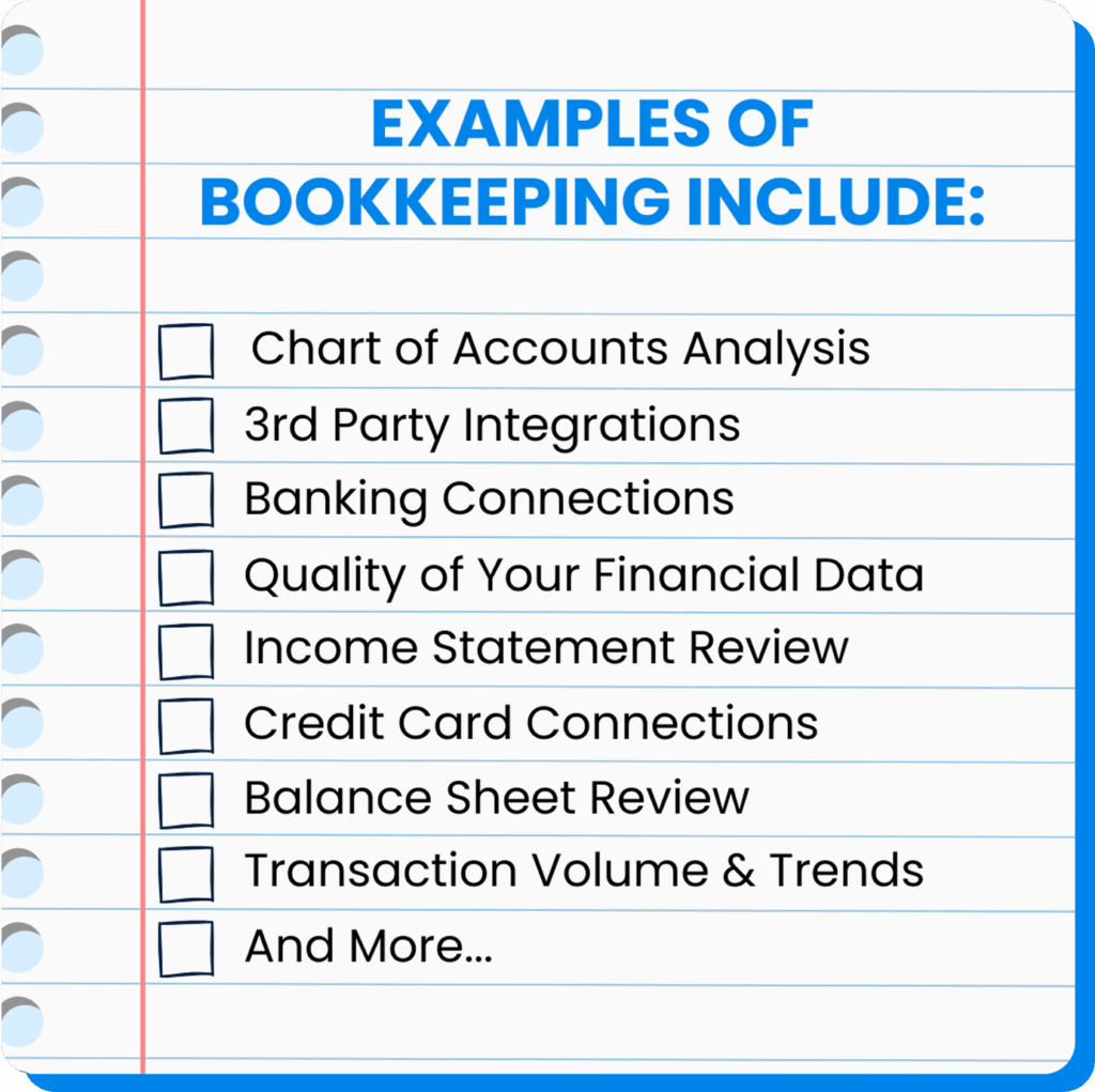 2. Bookkeeping Assessment – We’ll examine your current books to pinpoint what’s missing, what needs correction, and what improvements are needed to get you meaningful financial data.