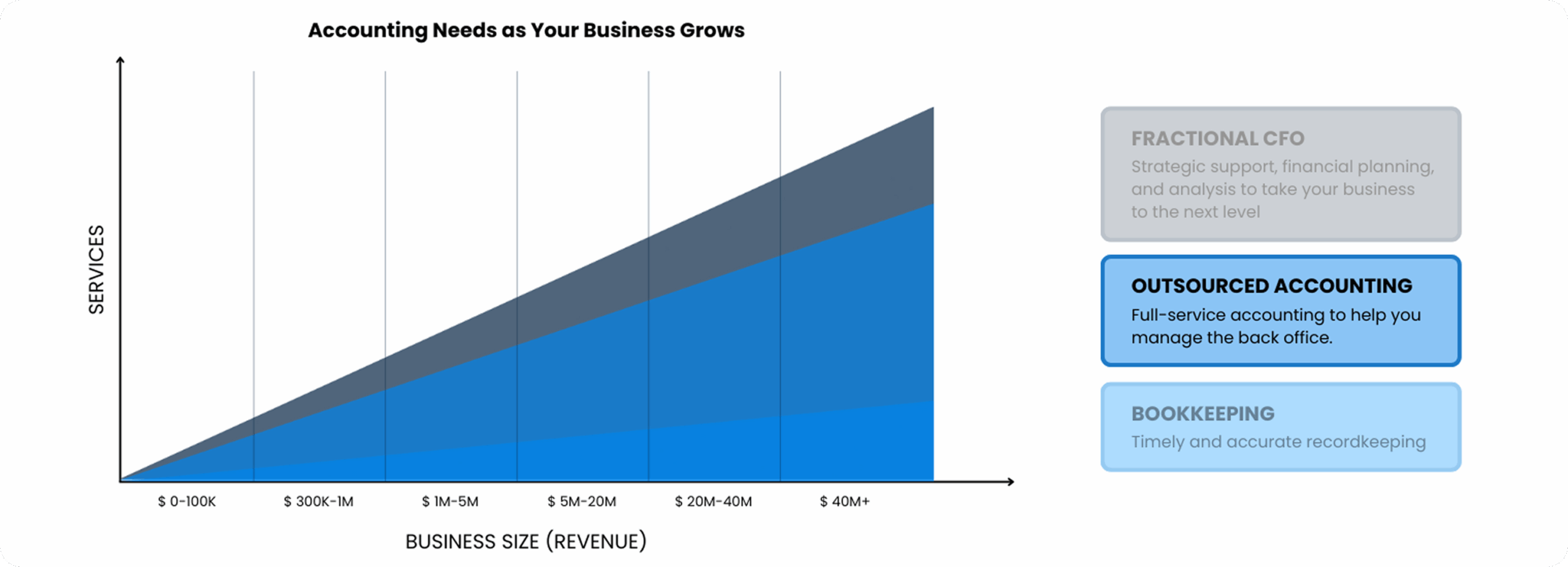 As your business expands, we can scale our services to meet your evolving needs—from basic bookkeeping to advanced financial planning and CFO-level support. You’ll always have the right level of expertise to match your stage of growth.